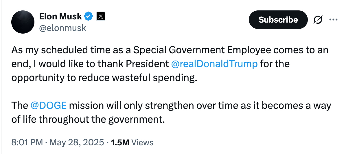🚨 1. Elon Musk Leaves Trump Administration Role