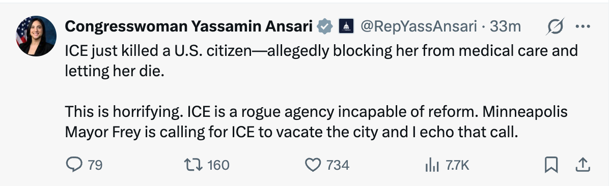 “ICE just killed a U.S. citizen—allegedly blocking her from medical care and letting her die,” Ansari said. “This is horrifying. ICE is a rogue agency incapable of reform.”