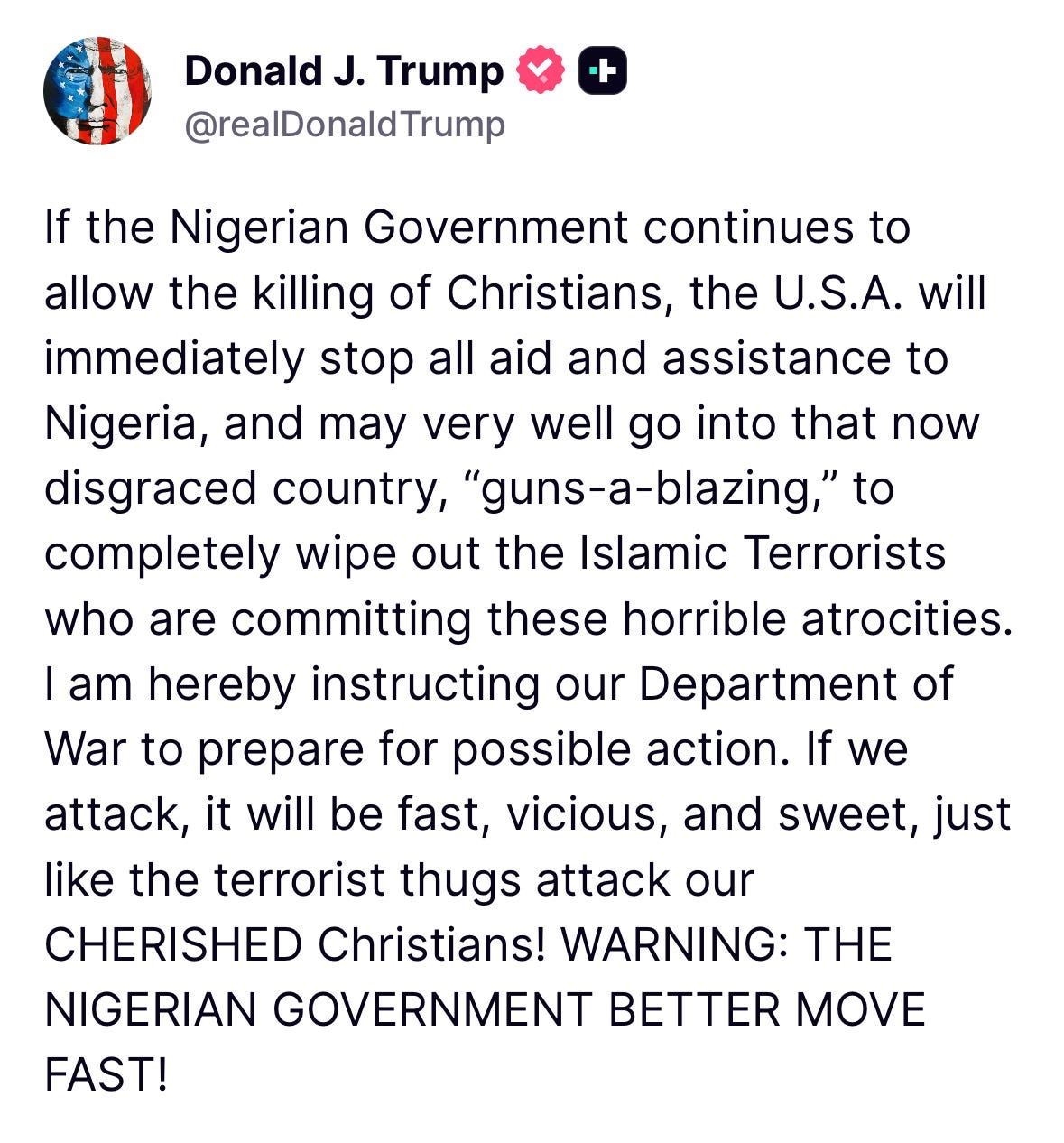 Good evening, everyone. I hope your Saturday is going well. In the past hour we learned that Donald Trump has ordered the Department of Defense to prepare for war with Nigeria. He has also declared attacking him to be “likely illegal.”