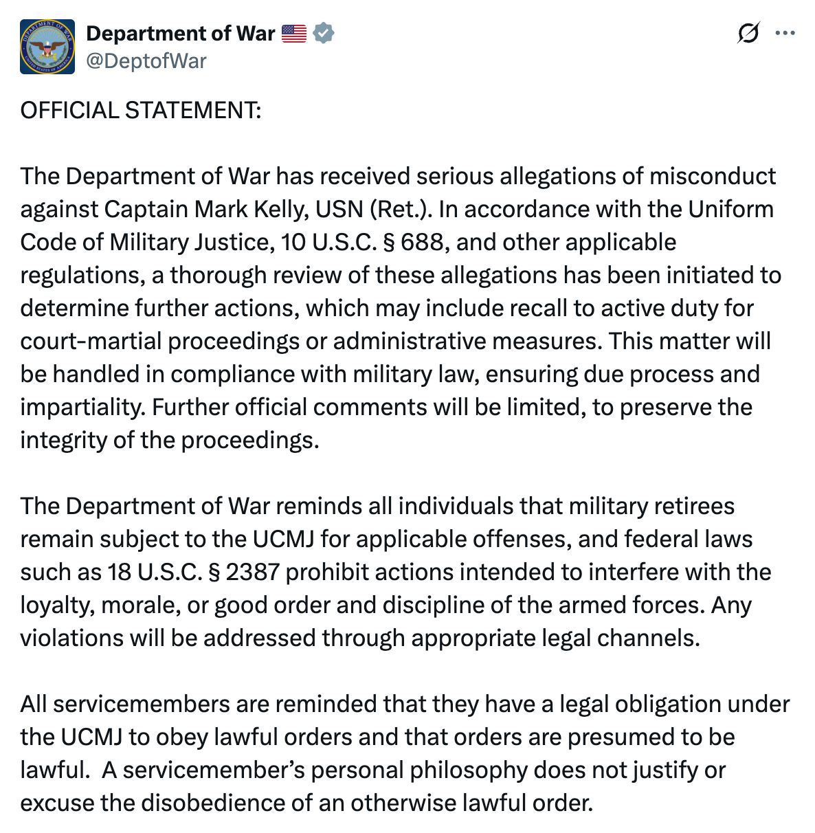 “The Department of War has received serious allegations of misconduct against Captain Mark Kelly, USN (Ret.). In accordance with the Uniform Code of Military Justice, 10 U.S.C. § 688, and other applicable regulations, a thorough review of these allegations has been initiated to determine further actions, which may include recall to active duty for court-martial proceedings or administrative measures.”