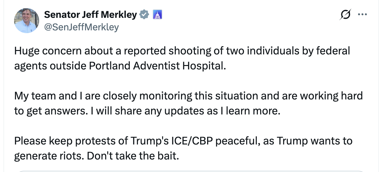 U.S. Senator Jeff Merkley of Oregon also weighed in, urging residents to remain peaceful amid growing tensions surrounding federal enforcement actions.