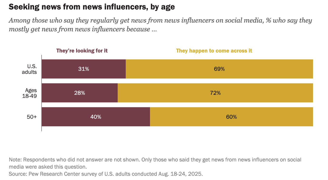 The reasons vary significantly by age. About half of adults fifty and older say they follow news influencers because the influencers express opinions or values they agree with. Only thirty five percent of adults under fifty say the same. Older adults also place higher value on authenticity, with fifty eight percent citing it as a major reason compared with forty five percent of younger adults.