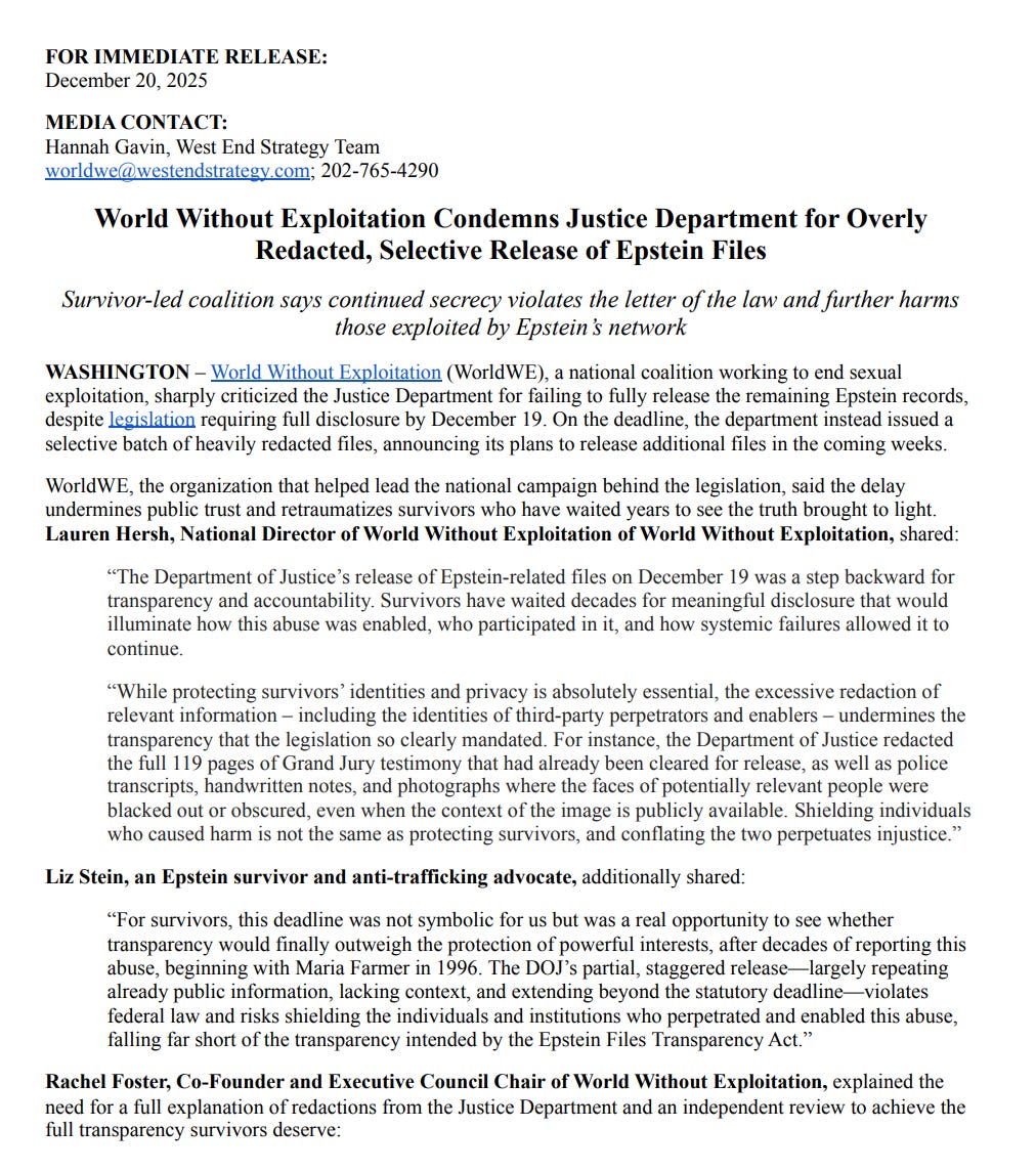 Outside the administration, criticism is intensifying. World Without Exploitation, an organization that works closely with survivors of sexual exploitation, has issued a blistering condemnation of the Trump Administration’s handling of the Epstein file release. The group argues that the process has retraumatized survivors and failed to center their safety and dignity.