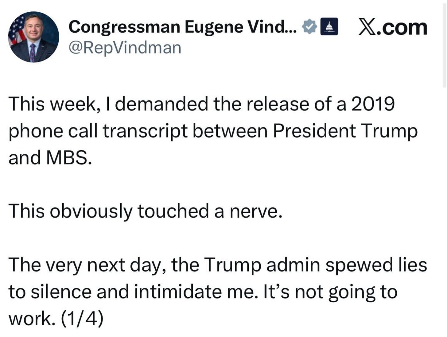 Rep. Eugene Vindman urged the declassification of a 2019 call between Trump and Saudi Crown Prince Mohammed bin Salman after Jamal Khashoggi’s murder, saying the transcript he reviewed on the National Security Council was “highly disturbing” and would “shock” Americans, as he accused Trump of rewriting the crown prince’s role in the killing during a recent White House meeting, while Khashoggi’s widow and House Democrats pressed for transparency despite the low likelihood the White House will release the document.