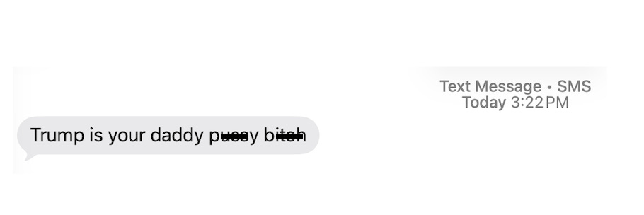 On a personal note, my phone number appears to have been leaked today. I received this message attacking me directly. I crossed out parts of the words because they were extremely vulgar: