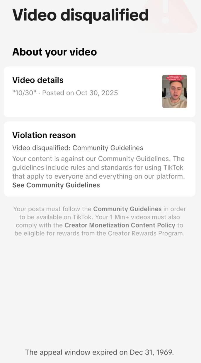When I posted a short TikTok video about these updates, the platform immediately took it down, labeling it a community guidelines violation. They refused to allow an appeal, citing that my “appeal window expired in 1969.” Yes, 1969. A year before the internet even existed.