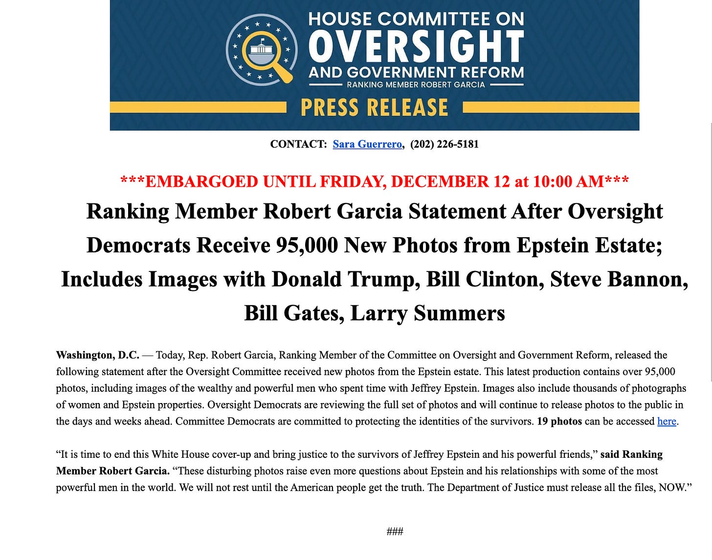 This morning, the House Oversight Committee has released a new set of images obtained from the estate of Jeffrey Epstein. These images include images of Donald Trump, Bill Clinton, Larry Summers, Bill Gates, Steve Bannon, and others. Some of the images are extremely disturbing in nature, and are part of a larger batch of documents that are set to be released to the public in one week. I am going to share some images below, some of them may be graphic, so please be advised before you continue to scroll. This is the release I received from the House Oversight Committee: