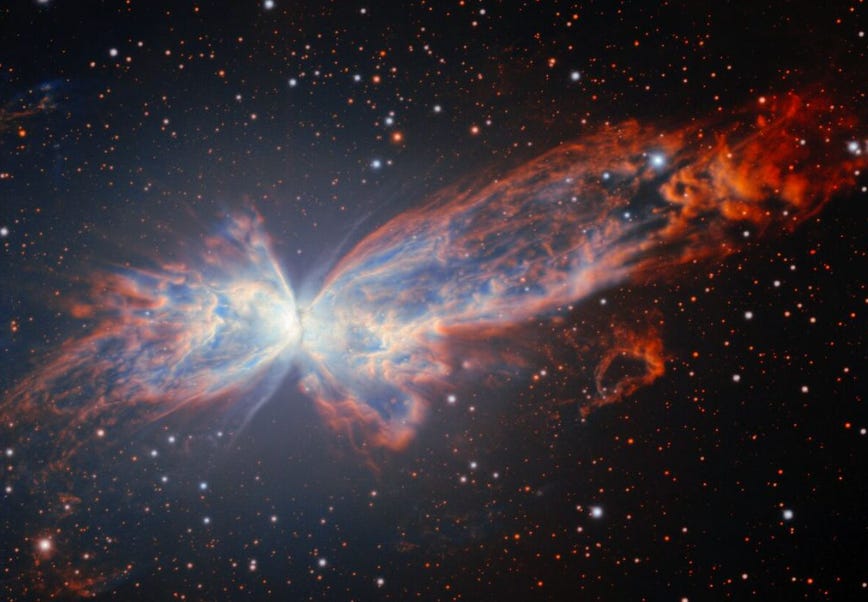 A new Gemini South Telescope image captures the Butterfly Nebula’s spectacular “wings” of glowing hydrogen and oxygen gas—shed by an ultra-hot white dwarf whose 450,000°F surface is sculpting one of the most striking planetary nebula shapes in the sky, chosen by Chilean students for the observatory’s anniversary contest.