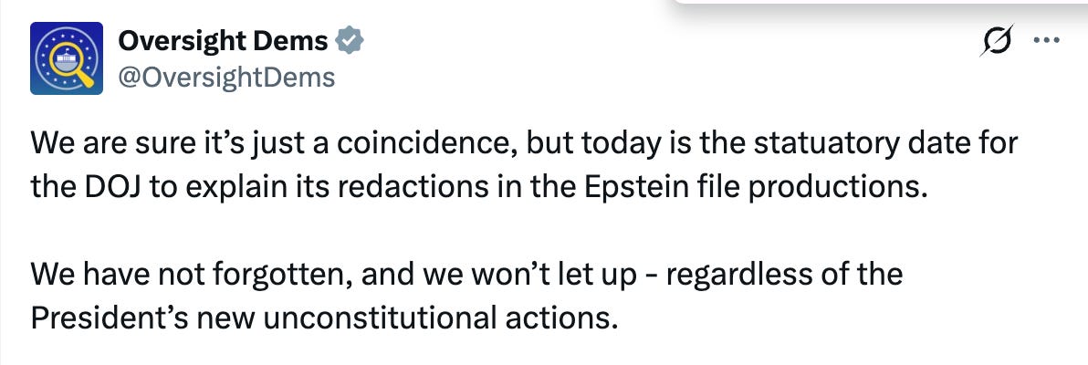 Source familiar with the Epstein files release tells me that Congress has yet to receive the Justice Department’s explanation for the Epstein files redactions. The Justice Department was required to inform Congress why it made redactions to the Epstein files. It failed to do so. This is another violation of the Epstein Files Transparency Act.
