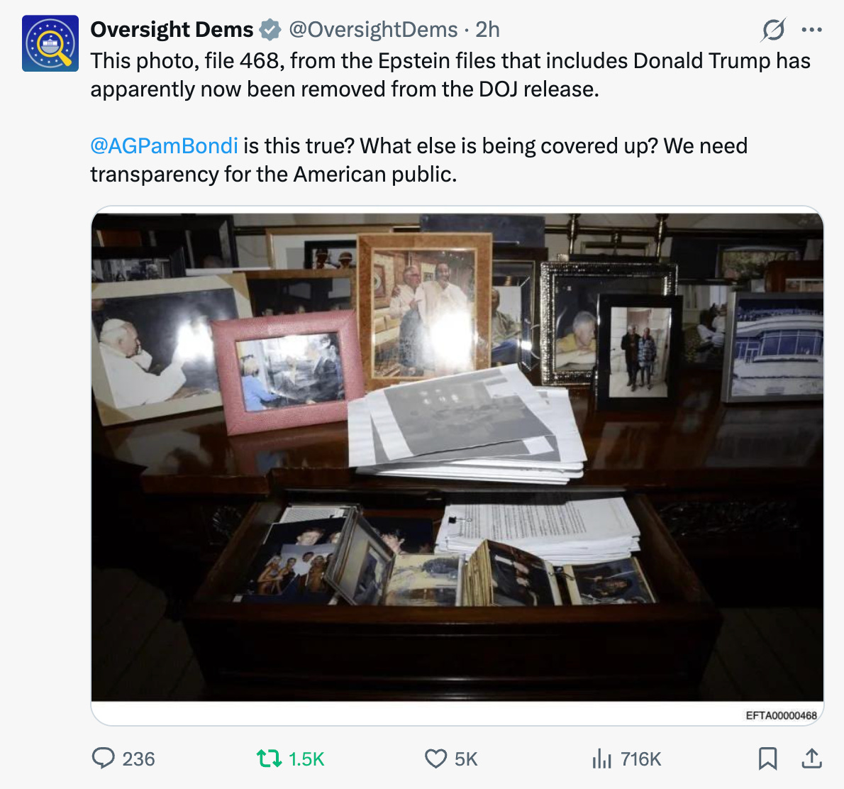 Earlier today, I noticed something that many others have since confirmed: overnight, the Department of Justice quietly removed one of the only publicly accessible photographs of Donald Trump contained in the Epstein document archive—identified as File 468. Until recently, the file was active on the Department’s website. It showed a photograph of Trump located inside Jeffrey Epstein’s desk drawer.
