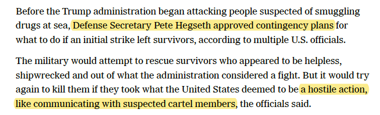 The US government’s new justification for intentionally killing two shipwrecked survivors is legally indefensible, highlighting that the NYT reports Hegseth approved contingency plans to target survivors, that labeling rescue communications or retrieval of cocaine as “hostile acts” violates core laws-of-war protections for shipwrecked civilians, and that invoking “war-sustaining” targeting theory cannot transform helpless survivors into lawful military targets.